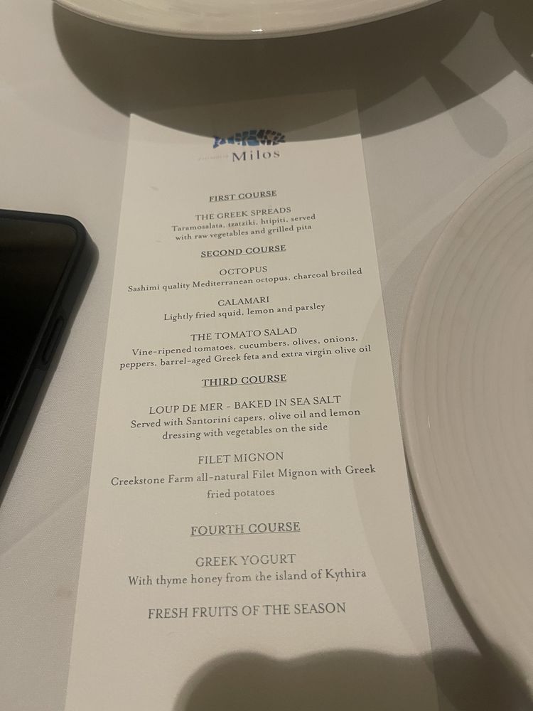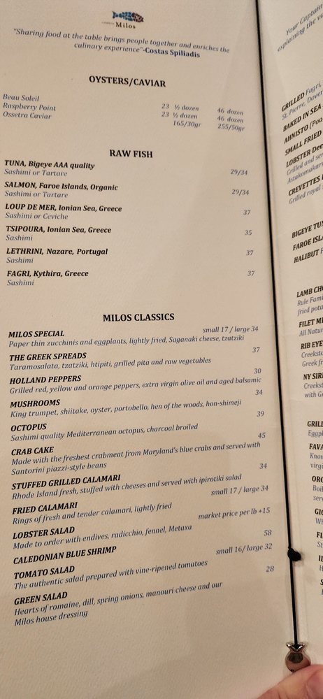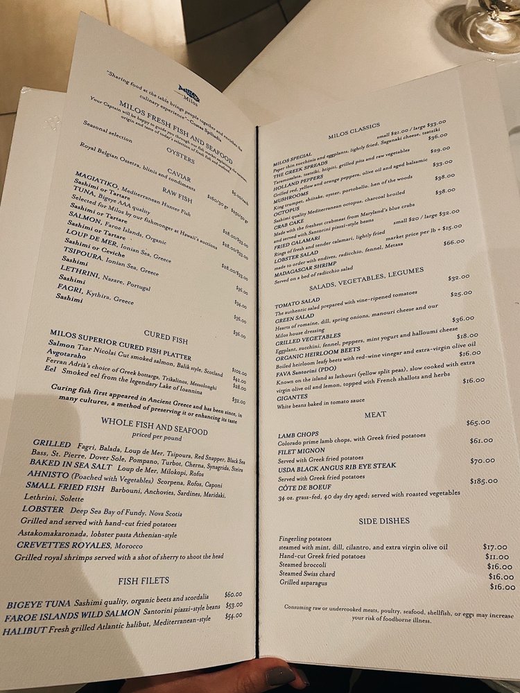Estiatorio Milos - Midtown New York is a Greek-Mediterranean seafood restaurant located in the heart of New York City. The menu features a variety of dishes highlighting the freshest seafood sourced from around the world. From Oysters to Caviar, Raw Fish selections like Tuna and Salmon, to Greek specialties like Loup de Mer and Tsipoura, the menu is a culinary masterpiece.